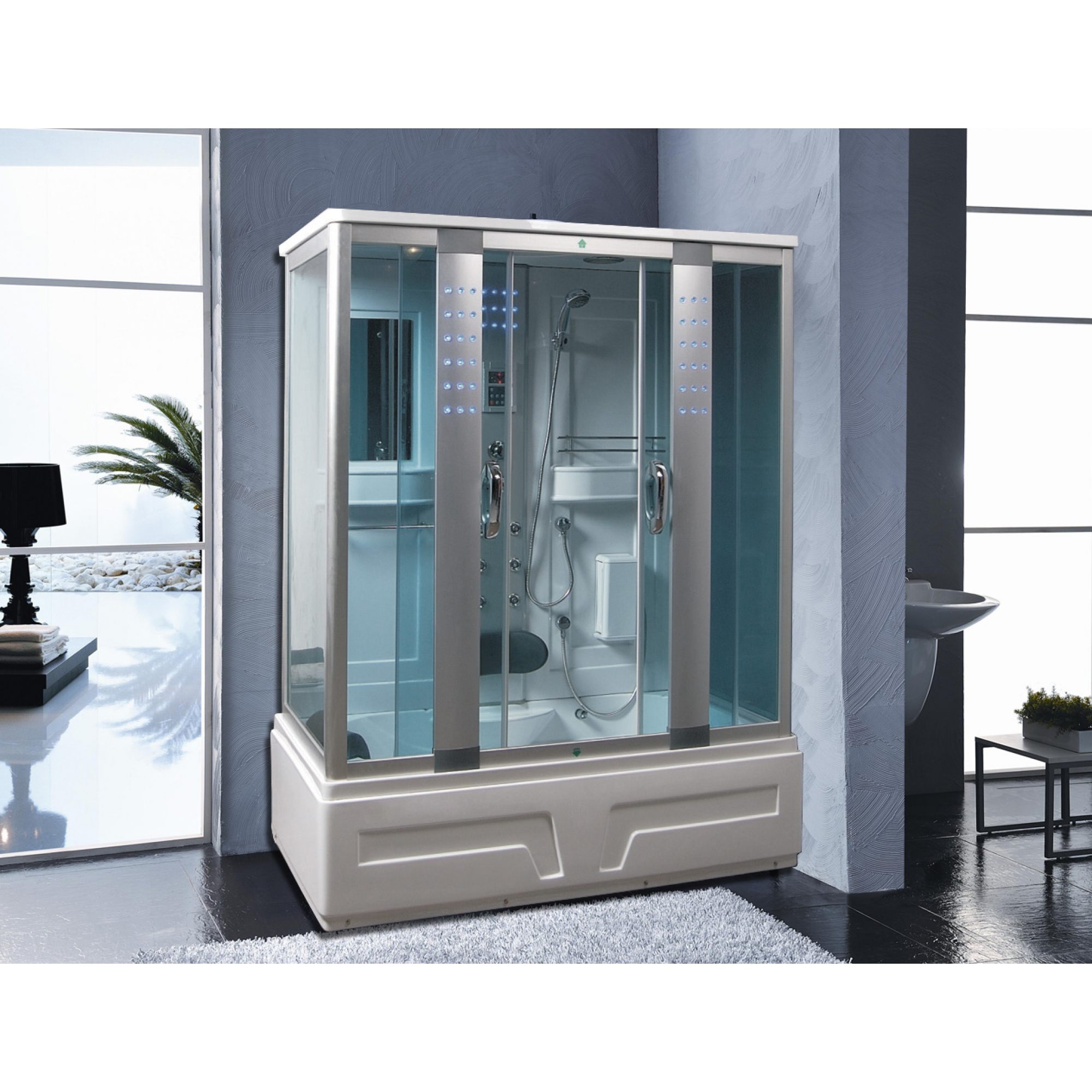 Il pannello di controllo digitale touchscreen, la chiusura delle porte magnetica, le rifiniture in alluminio satinato, il vetro temperato ed oscurato da 6,5 mm anti infortunio, il doccione superiore illuminato, il massaggio plantare, la sauna, l’apparecchiatura telefonica in vivavoce, la radio FM e la predisposizione per i compact disc sono alcune delle spettacolari funzionalità che contraddistinguono questa cabina.