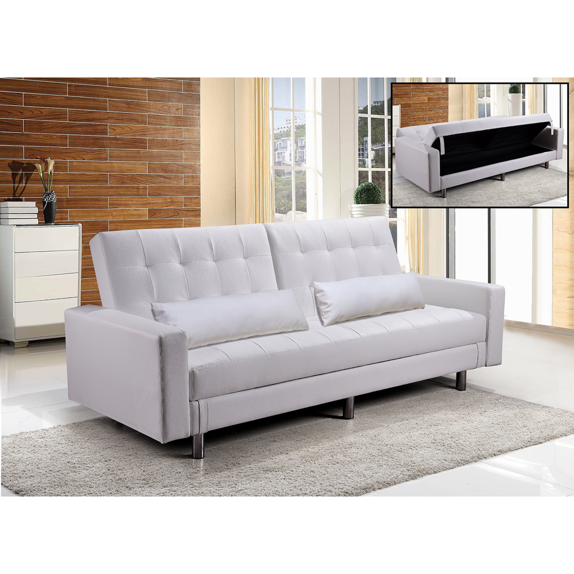 Divano Letto Reclinabile Contenitore. in Ecopelle di Alta qualità , colore Bianco, tre posti a sedere, Letto aperto da una piazza e 1/2 con sistema antiribaltamento, comprensivo di Cuscini in ecopelle. Piedini in Metallo.Dotato di vano contenitore