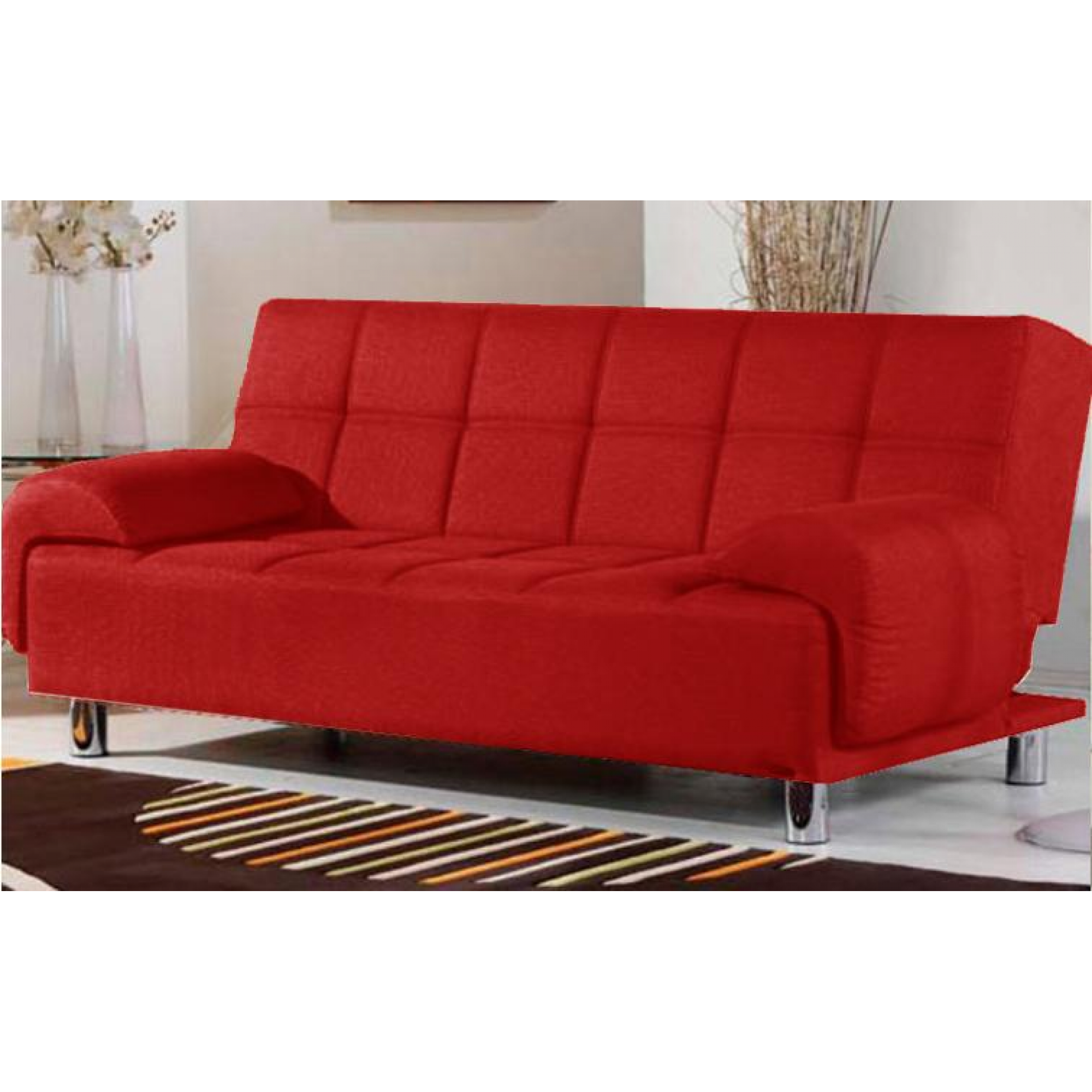 Divano Letto Reclinabile in Ecopelle di Alta qualità , colore Rosso, tre posti a sedere, Letto aperto da una piazza e 1/2 con sistema antiribaltamento, comprensivo di Cuscini in ecopelle. Piedini in Metallo.