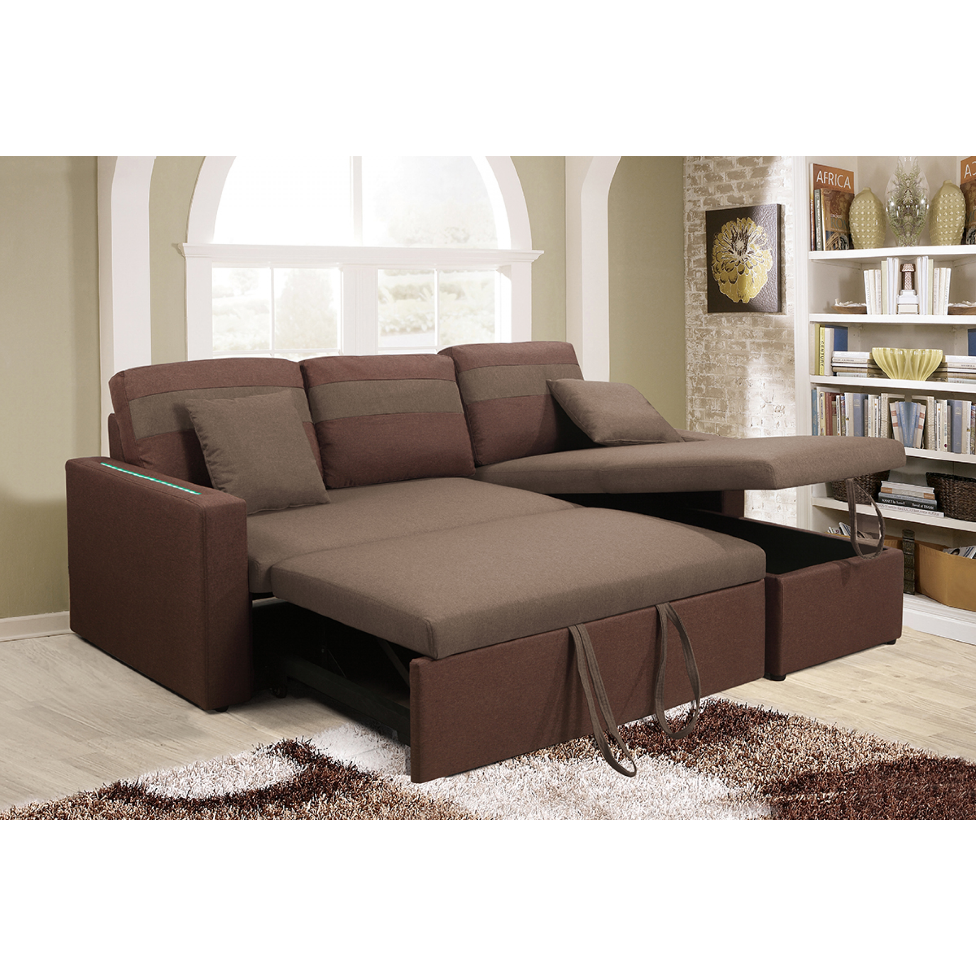 DIVANO LETTO ANGOLARE CONTENITORE REVERSIBILE MICROFIBRA MARRONE LED