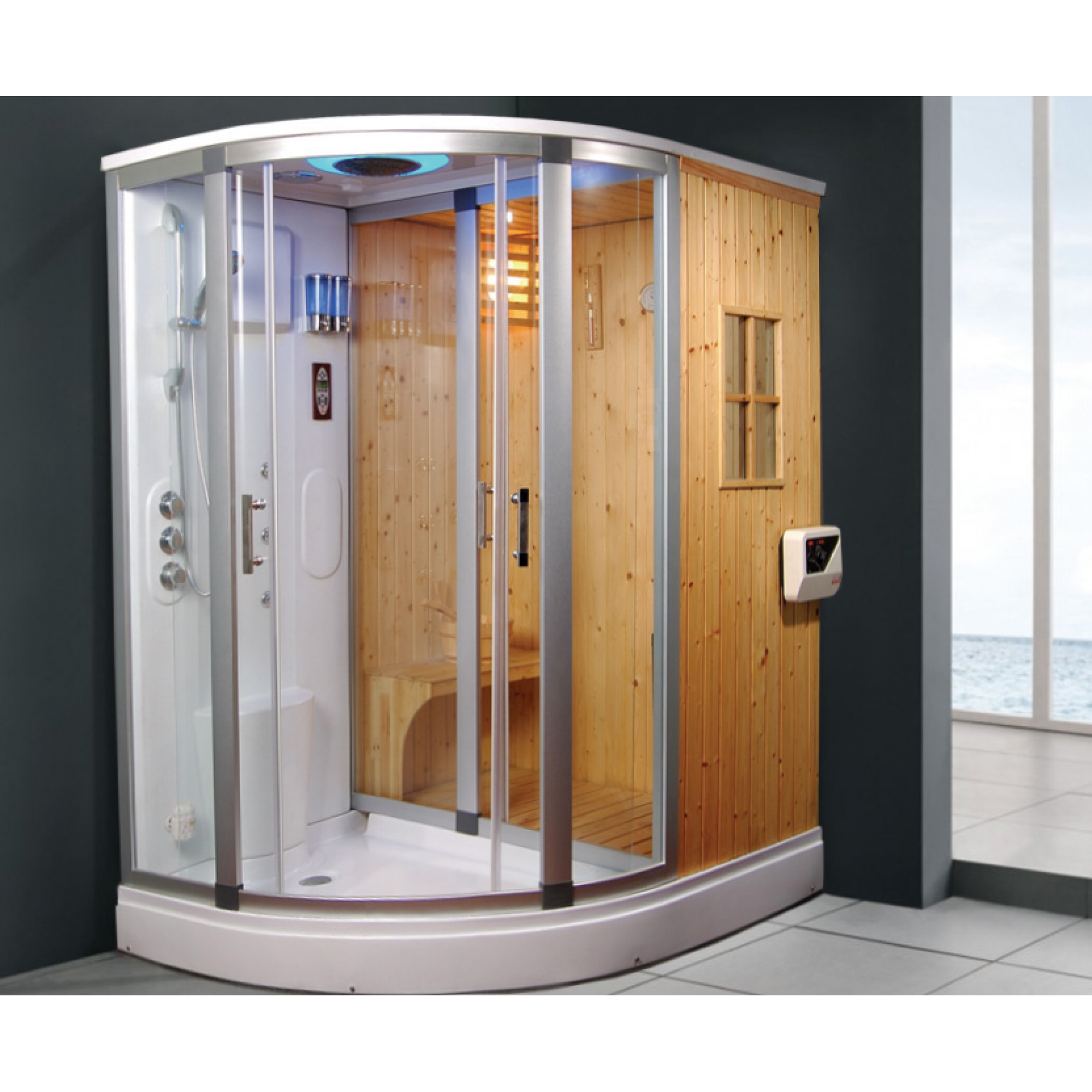 Leggete tutte le caratteristiche eccezionali che vengono sotto elencate! Questo modello a differenza delle nuove saune e sistemi idromassaggio ha in aggiunta il bagno turco + stufa in ceramica per ambiente finlandese, la doccia idromassaggio a 6 idrogetti, il pannello computer pc full touch digitale, la chiusura porte magnetica, le rifiniture in alluminio satinato, il vetro temperato da 6,5mm antinfortunio di separazione tra gli ambienti, il doccione superiore illuminato, l'apparecchiatura telefonica in vivavoce, doccia idromassaggio, materiale usato legno canadese, radio pc full touch, cromoterapia, aromaterapia, cronotermostato digitale, ozono e sistema di sanificazione aria con ventilazione!