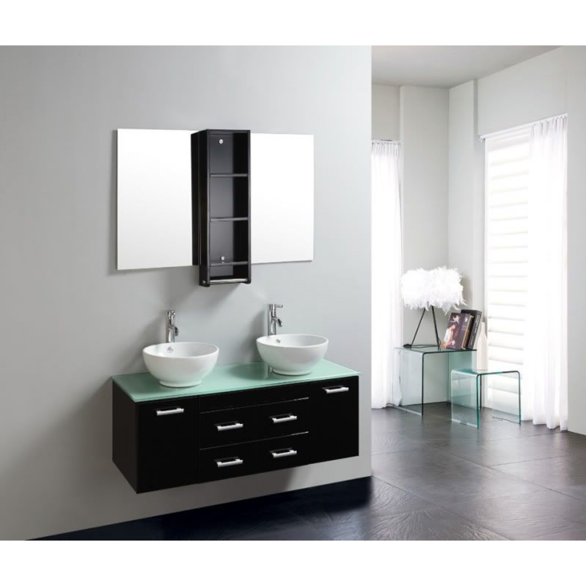 Mobile da Bagno Pensile Doppio da 120cm, colore Nero, completo di Doppio Lavabo, Mobile Pensile, Specchio, Mobiletto centrale con Mensole e Rubinetteria inclusi.