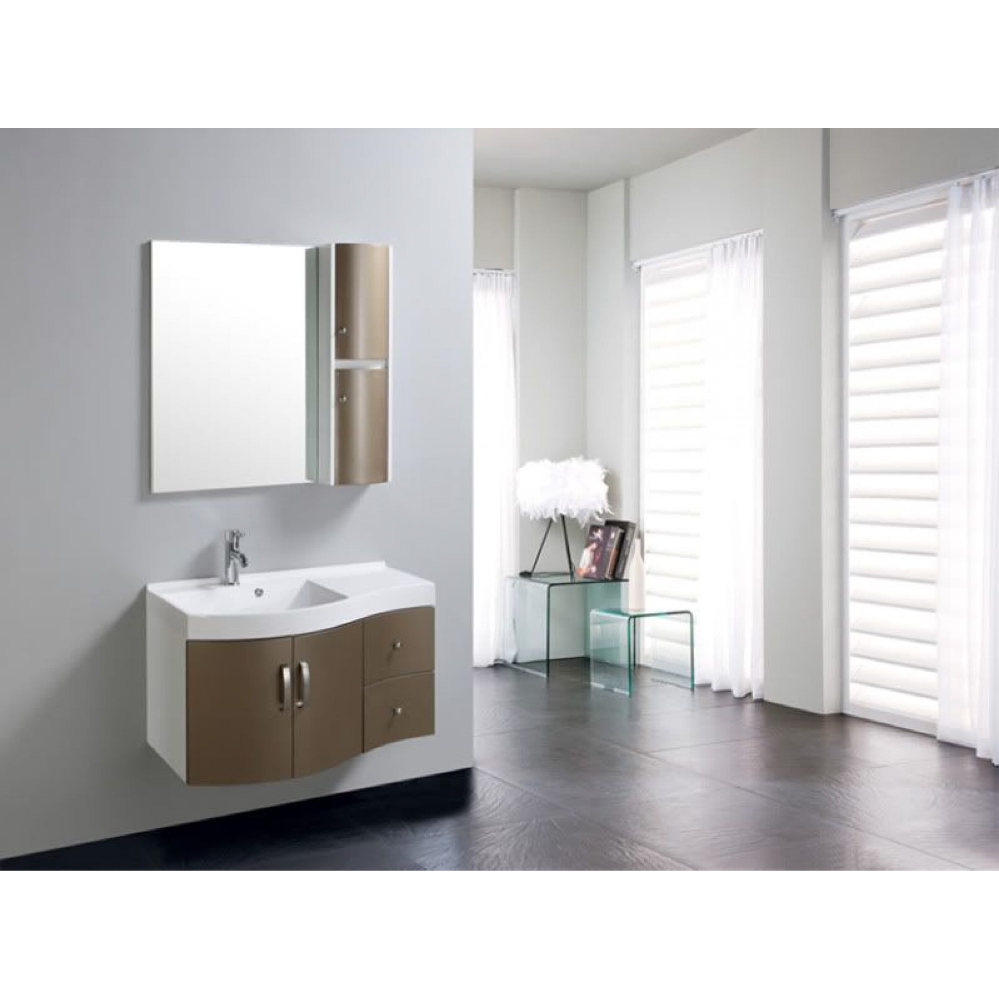 Mobile da Bagno Pensile Design, da 90cm, Completo di tutto, Mobile colore Marrione con Sportelli e cassetti, Lavabo, Specchio, Colonna Pensile con Ripiani e Rubinetteria.