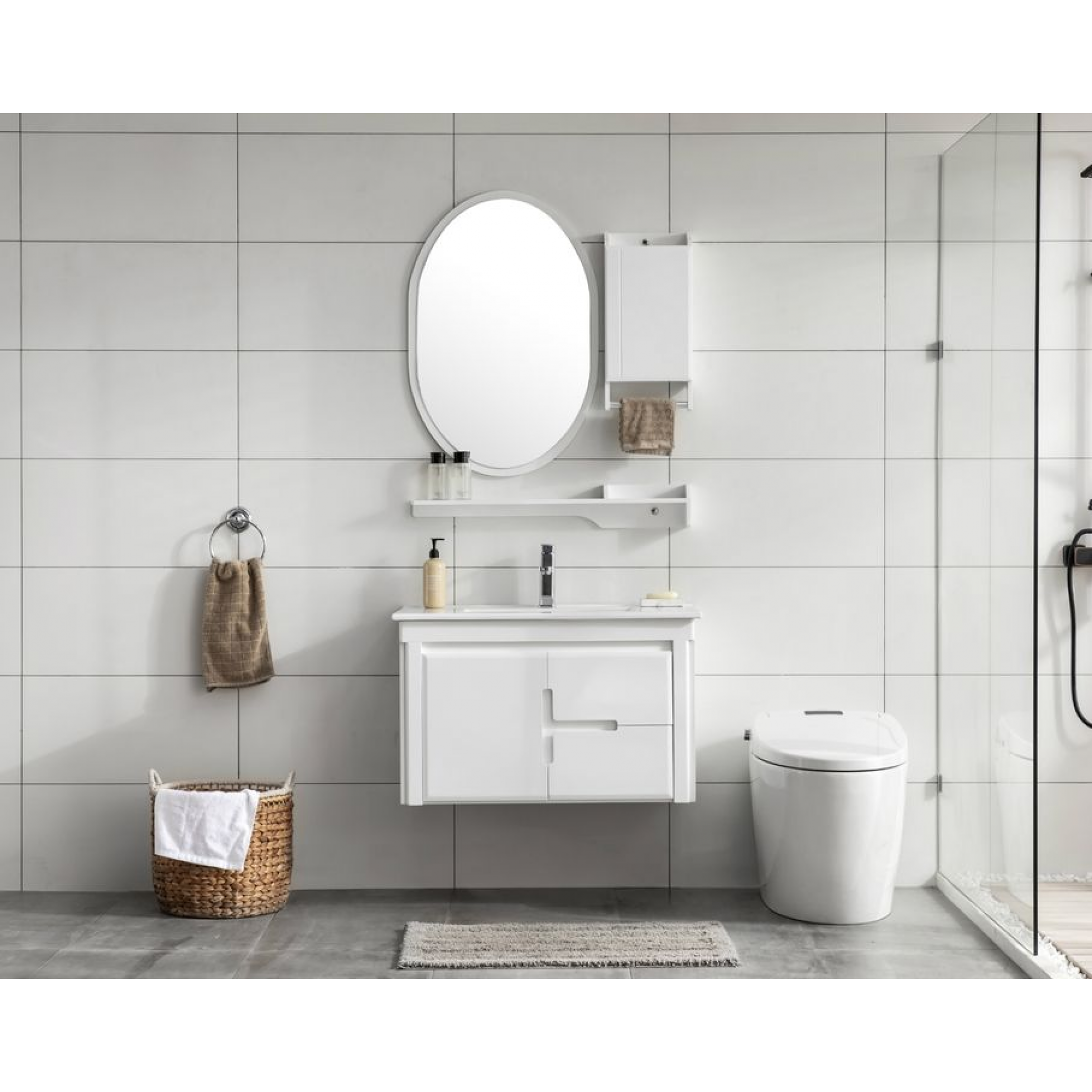 Mobile da Bagno Pensile Design, da 80cm, Completo di tutto, Mobile colore Bianco, Lavabo, Specchio, Armadietto, Mensola e Rubinetteria.