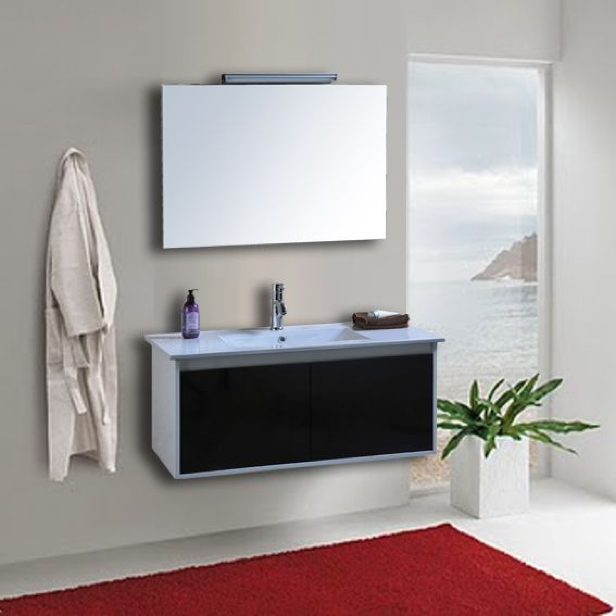 Mobile da Bagno Pensile Design, da 100cm, Completo di tutto, Mobile con Cassettone Apribile, colore Bianco e Nero, Lavabo, Specchio con Applique e Rubinetteria.