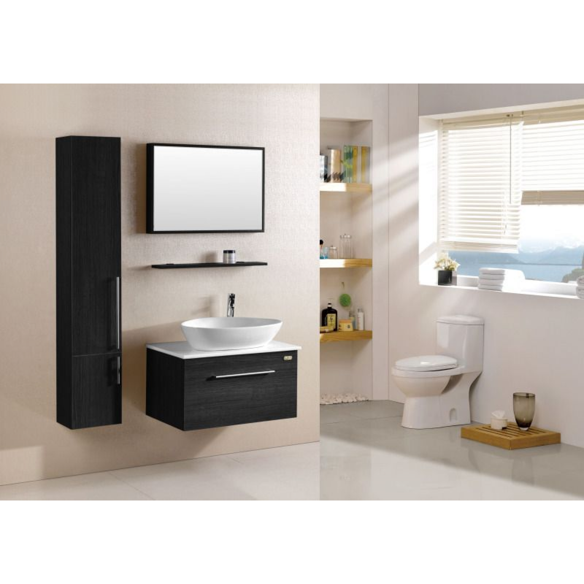 Mobile da Bagno Pensile Design, da 80cm, Completo di tutto, Mobile colore Wengé, Lavabo, Colonna Pensile, Specchio, Mensola in Legno e Rubinetteria.