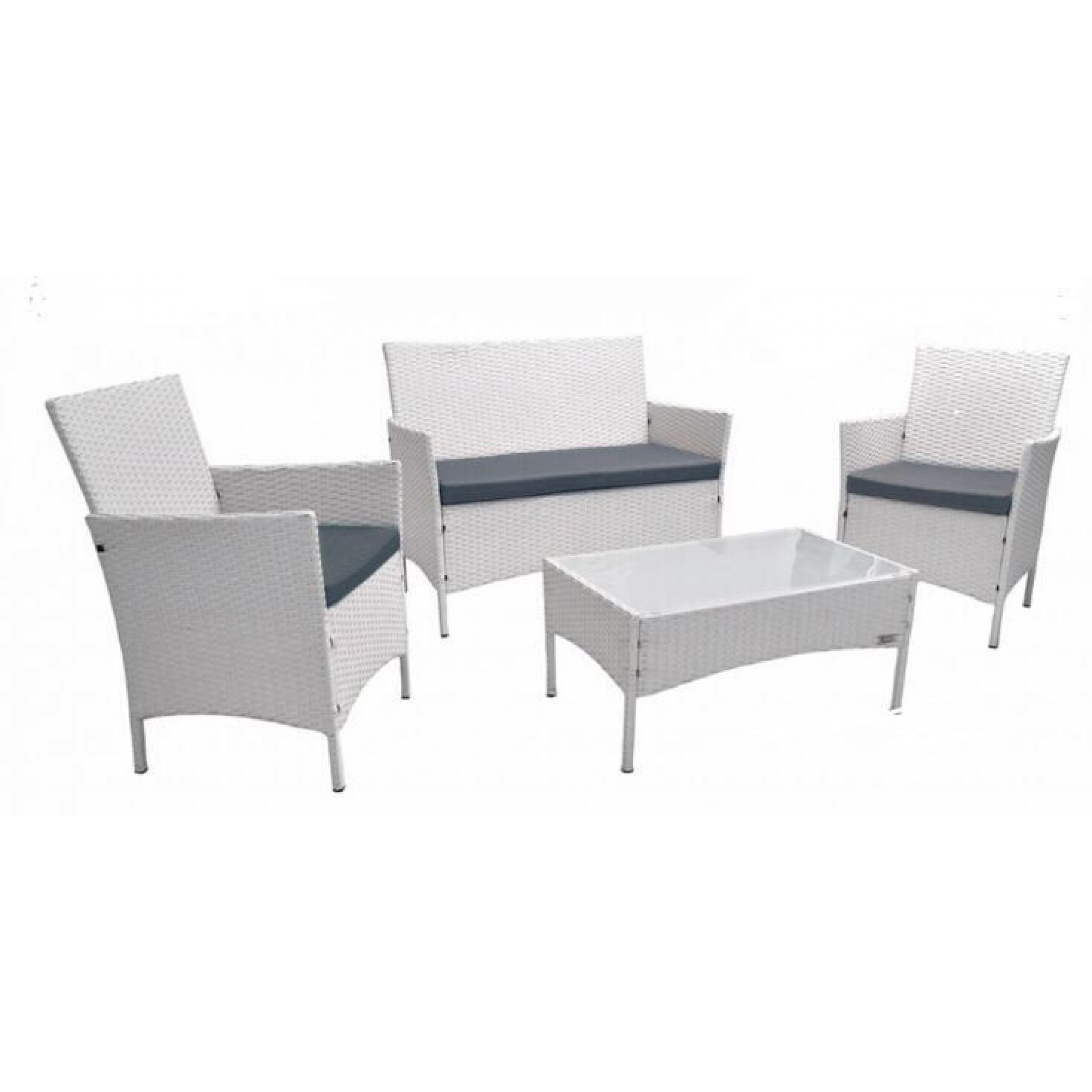 Divano Set da Esterno in Rattan colore Bianco, Set che comprende un comodo Sofà due posti, due Poltroncine e Tavolo con top in vetro, Cuscini inclusi nel set.