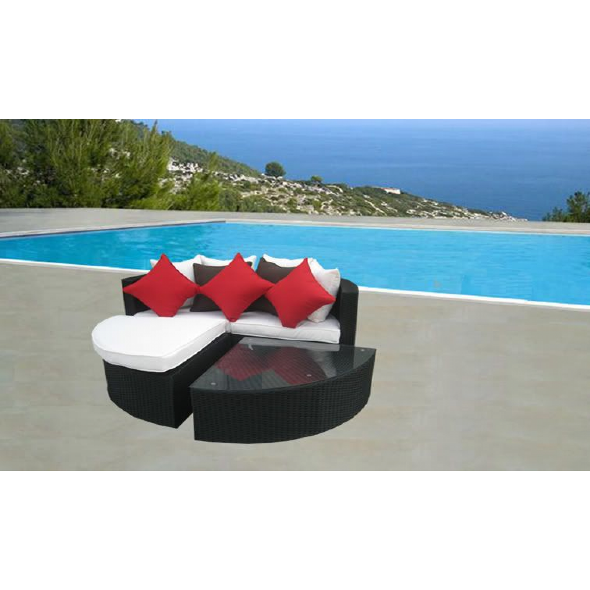 Divano Set da Esterno in Rattan colore Nero, Set che comprende un comodo Sofà semicircolare, Tavolino con top in vetro e pouf. Cuscini inclusi nel set come da foto.