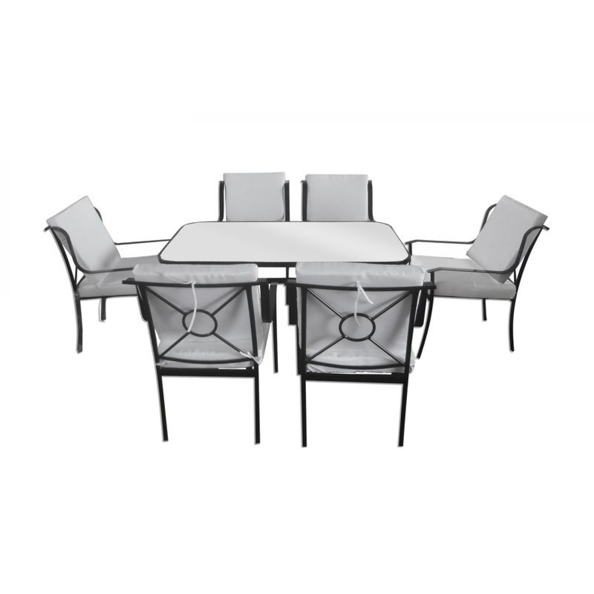 Set Tavolo in ferro da Esterno con ripiano in Vetro, incluse sei (6) sedie con braccioli e cuscini.