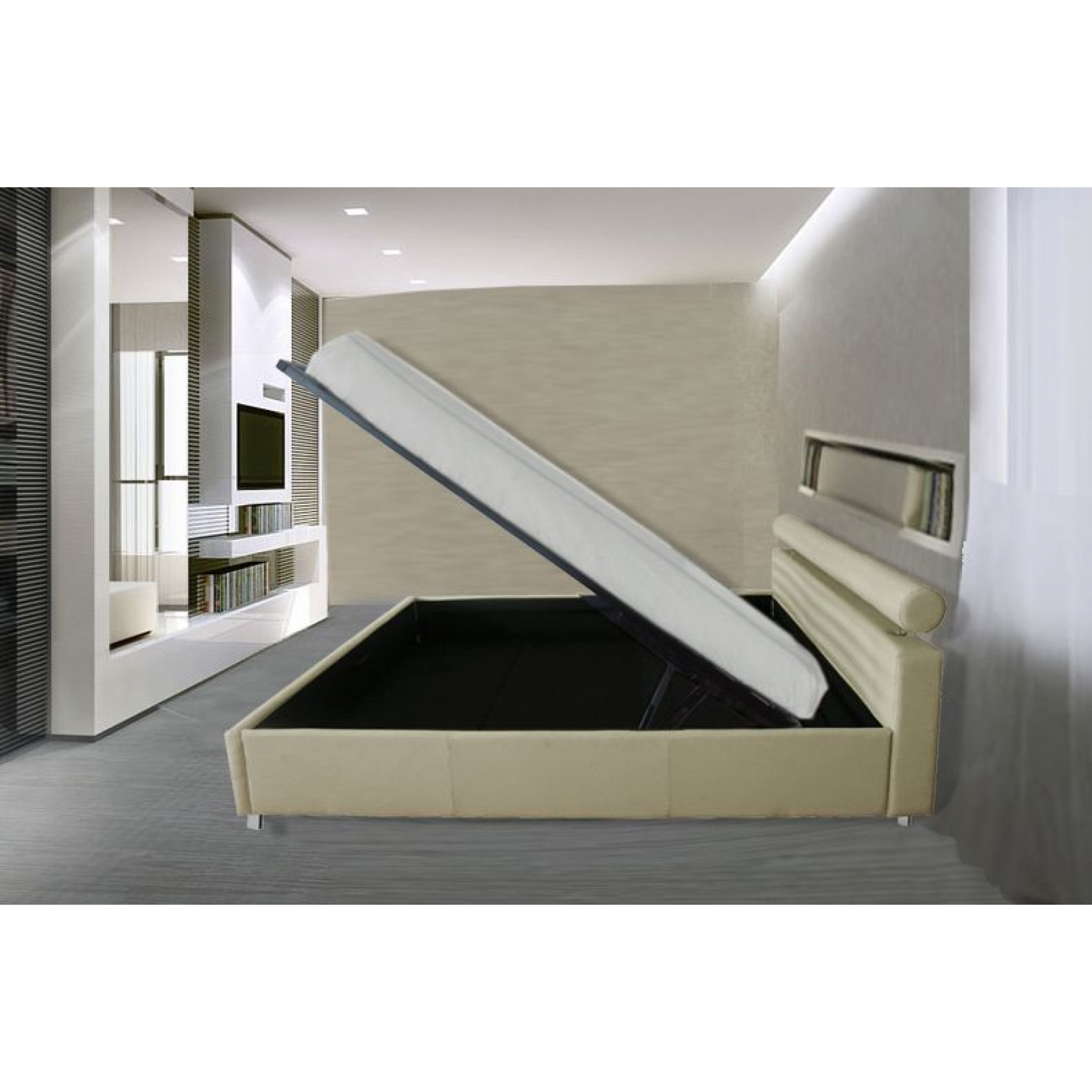 Letto Matrimoniale in Ecopelle Beige con ampio vano Contenitore. Dotato di Rete con Doghe in Legno.