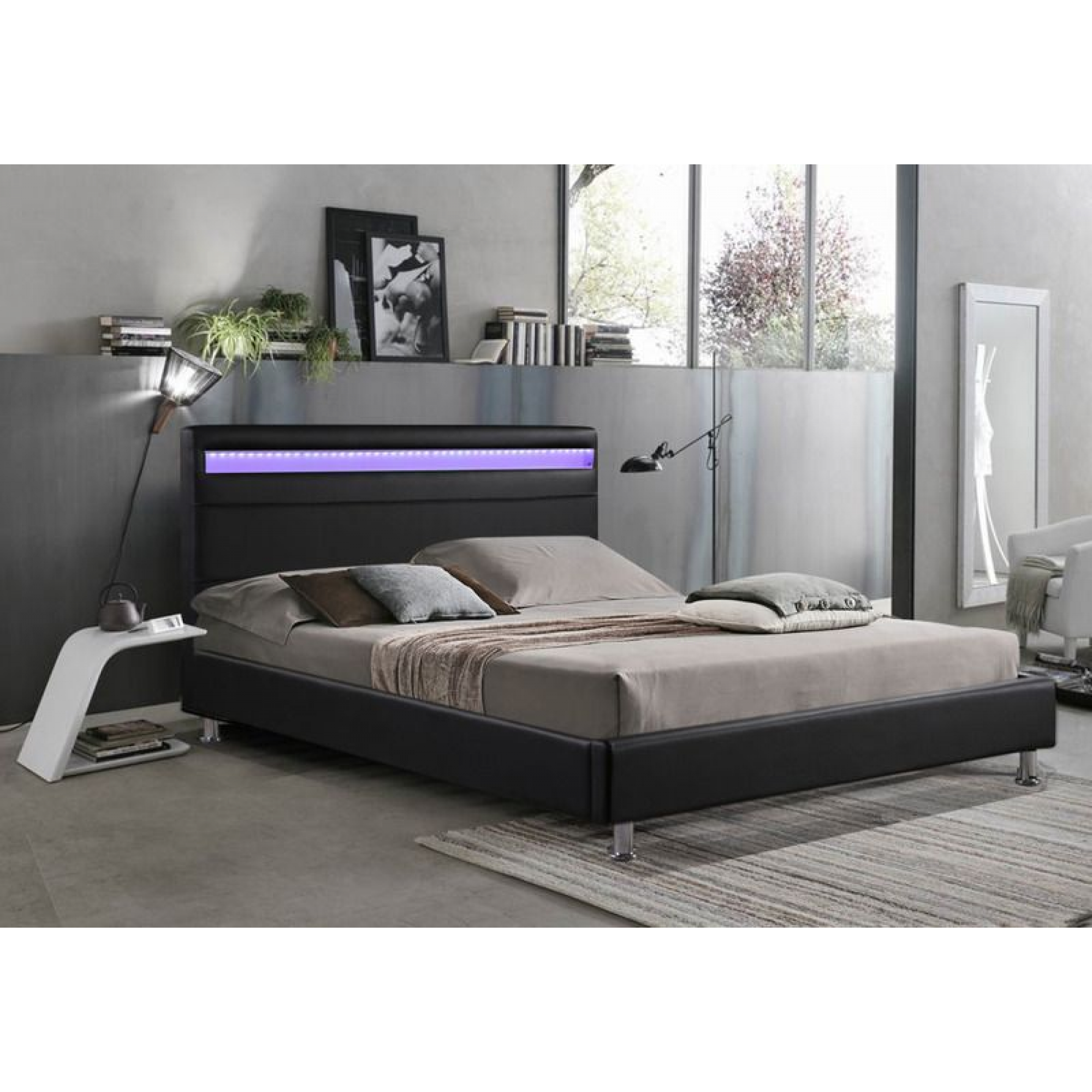Letto Matrimoniale in Ecopelle Nero con Luce Led Multicolore installata nella testata. Compreso di Rete con Doghe in Legno.