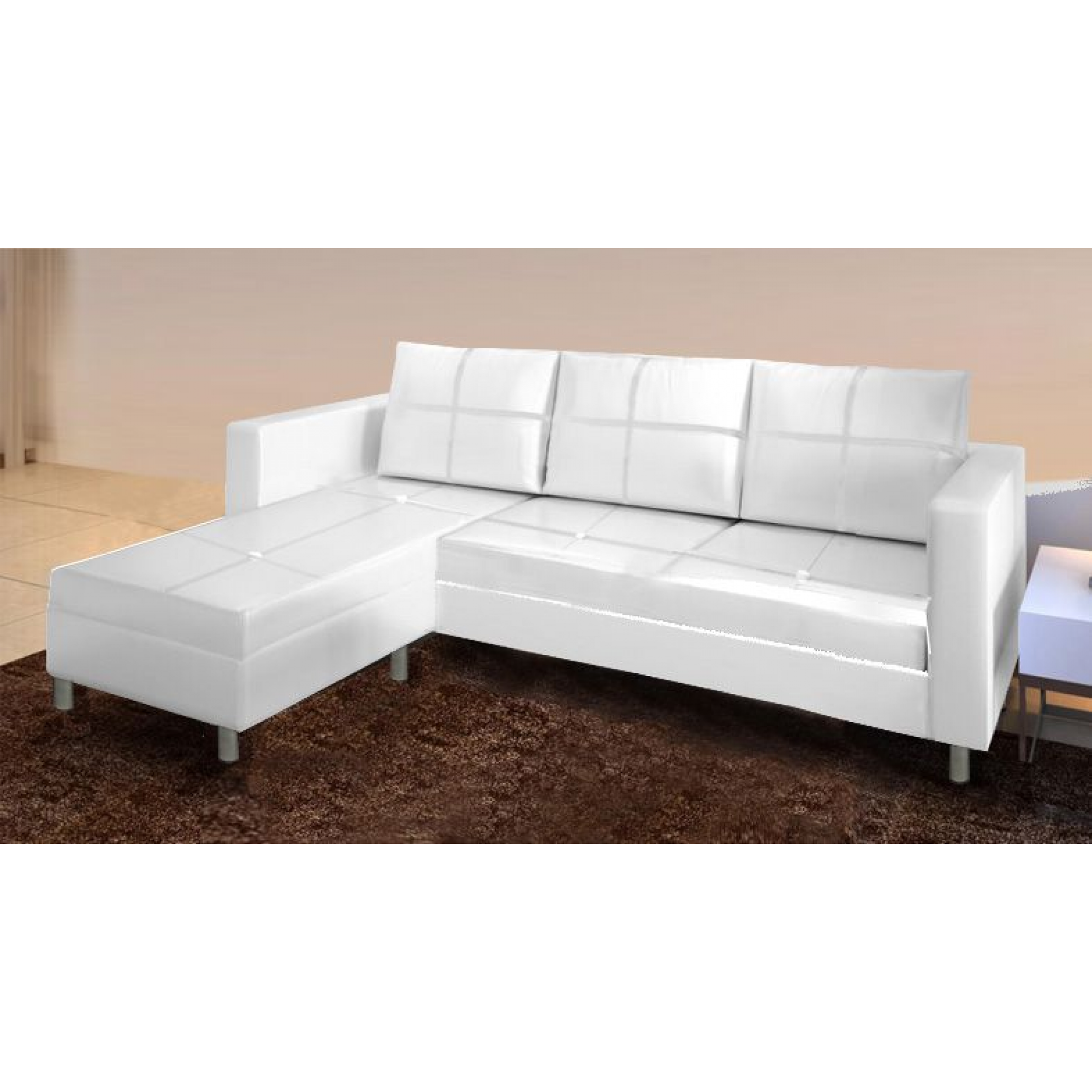 Divano Angolare Salotto in Ecopelle Bianco, lato Reversibile, dotato di comodo Pouf.