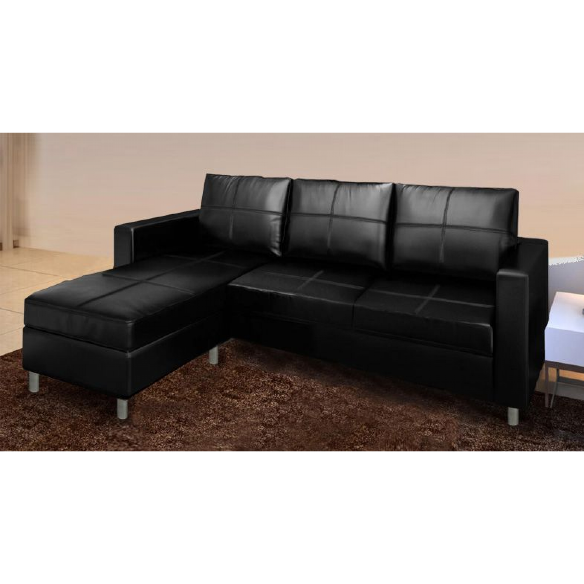 Divano Angolare Salotto in Ecopelle Nero, lato Reversibile, dotato di comodo Pouf.