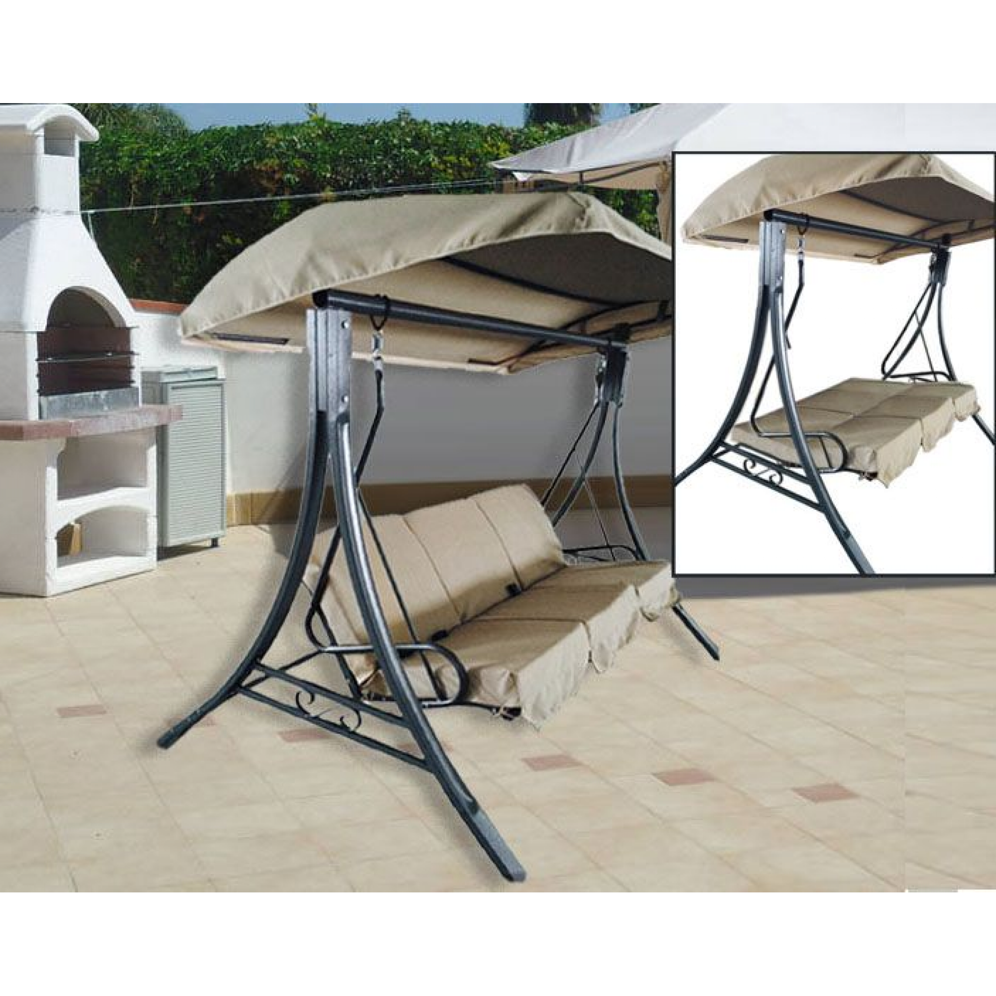 Gazebo dondolo che diventa letto da giardino 3 posti, con sistema trasformazione letto da ben 110cm da una piazza e 1/2, color ecrù, dotato di una solida struttura tubolare in ferro e cuscini spessorati da 10cm.