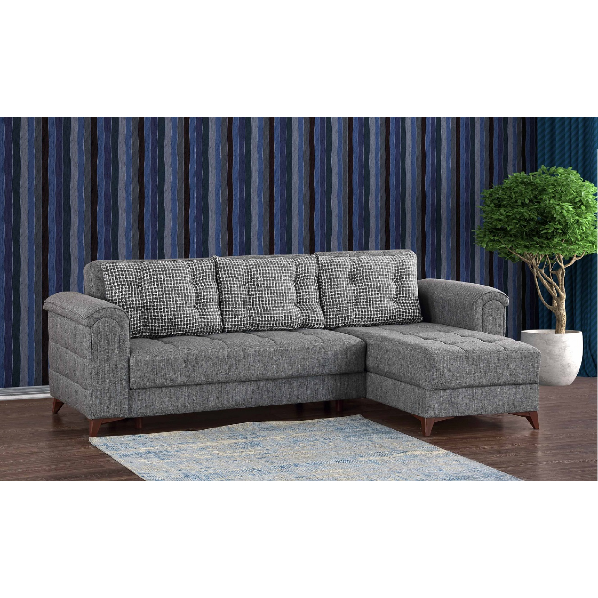 DIVANO LETTO ANGOLARE IN MICROFIBRA GRIGIO REVERSIBILE CON AMPIO VANO CONTENITORE POSTO SOTTO LA CHAISE LONGUE, COMPLETAMENTE USUFRUIBILE PER TUTTO IL SUO SPAZIO, CUSCINI ABBINATI IN MICROFIBRA, CHE NE CONFERISCONO UN TOCCO DI ELEGANZA SOBRIO ED UN INCONFONDIBILE STILE DAL DESIGN MODERNO ED ACCATTIVANTE.
