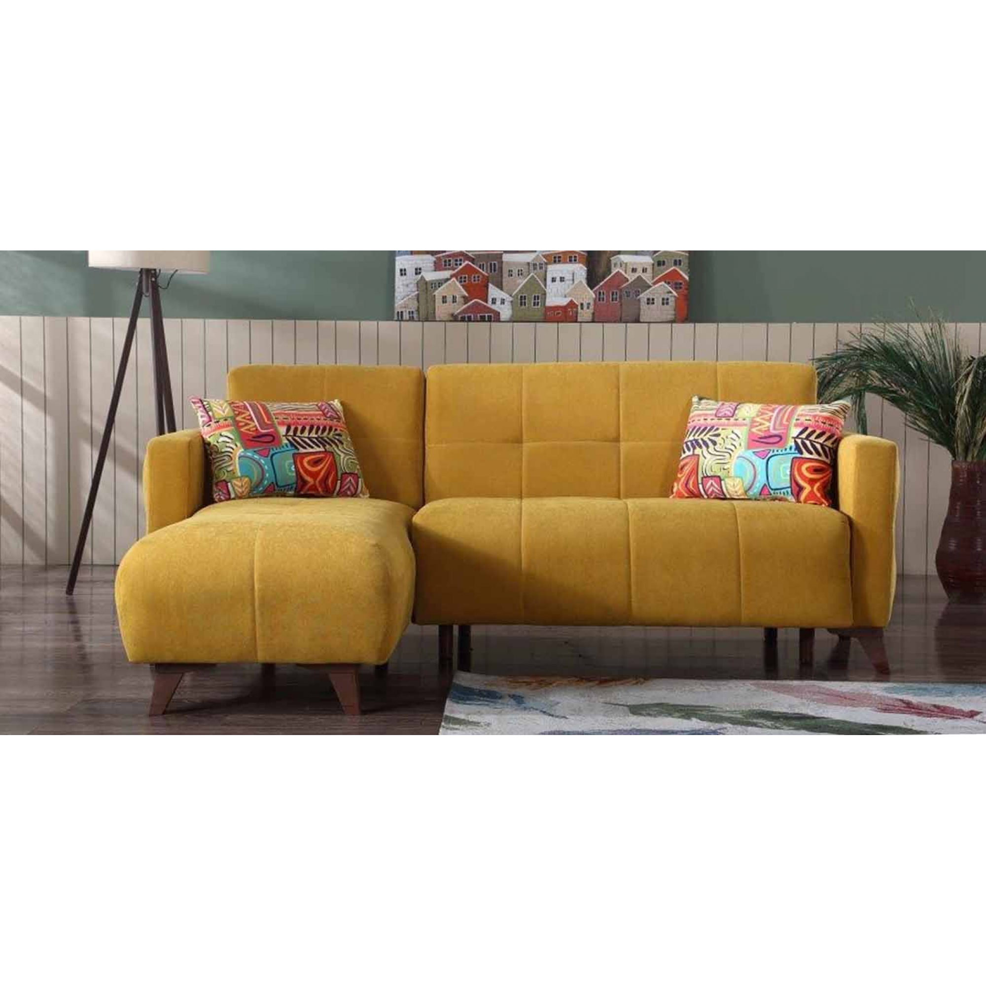 SOFA' - DIVANO LETTO ANGOLARE REVERSIBILE IN MICROFIBRA GIALLO SENAPE - VANO CONTENITORE IN MDF NOBILITATO NELLA CHAISE LONGUE - STILE MODERNO - CON BRACCIOLI, COMPRENSIVI DI CUSCINI!