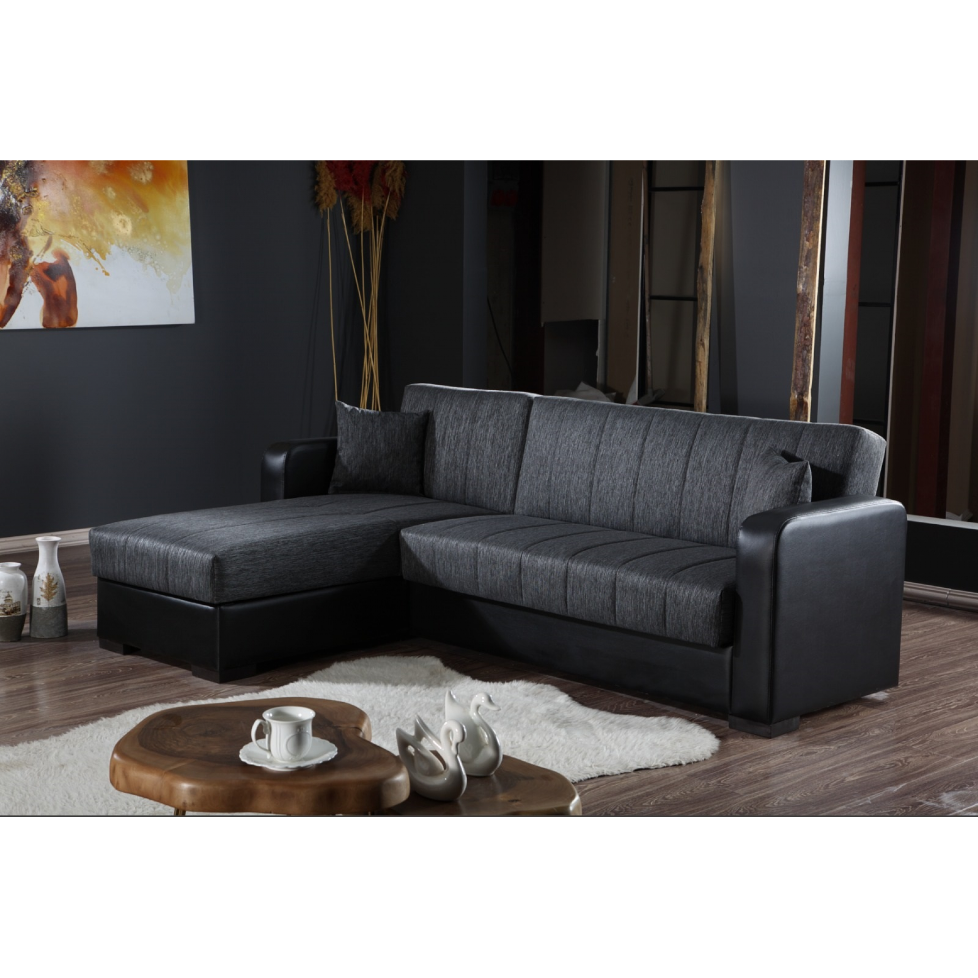 Splendido Divano Angolare con lato Reversibile in Ecopelle/Microfibra Nero / Grigio, dotato di funzione Letto, vano Contenitore, Cuscini abbinati inclusi.