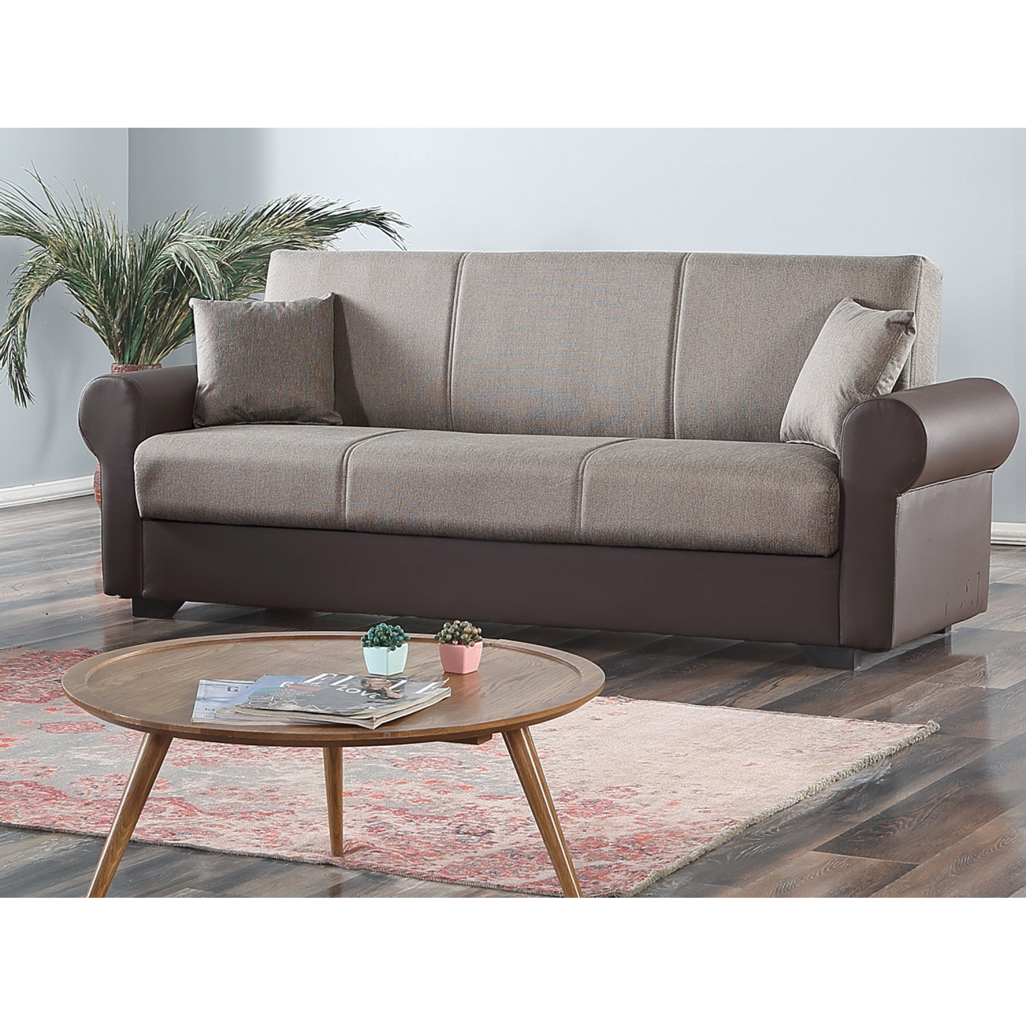 DIVANO LETTO CONTENITORE ECOPELLE / MICROFIBRA MARRONE / BEIGE CHIARO RECLINABILE CUSCINI DOPPIO - LUX