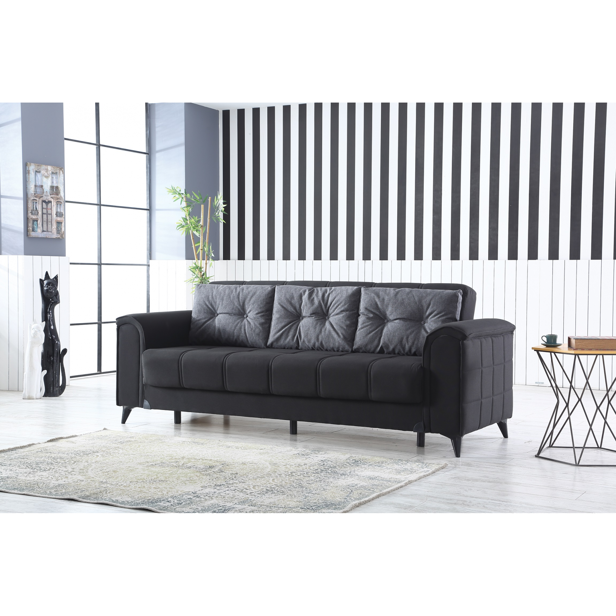 Divano Letto Reclinabile Contenitore. in Microfibra di Alta qualità , colore Nero, stile Chester, tre posti a sedere, Letto aperto da una piazza e 1/2 con sistema antiribaltamento, comprensivo di Cuscini. Piedini in Rinformzati.Dotato di vano contenitore