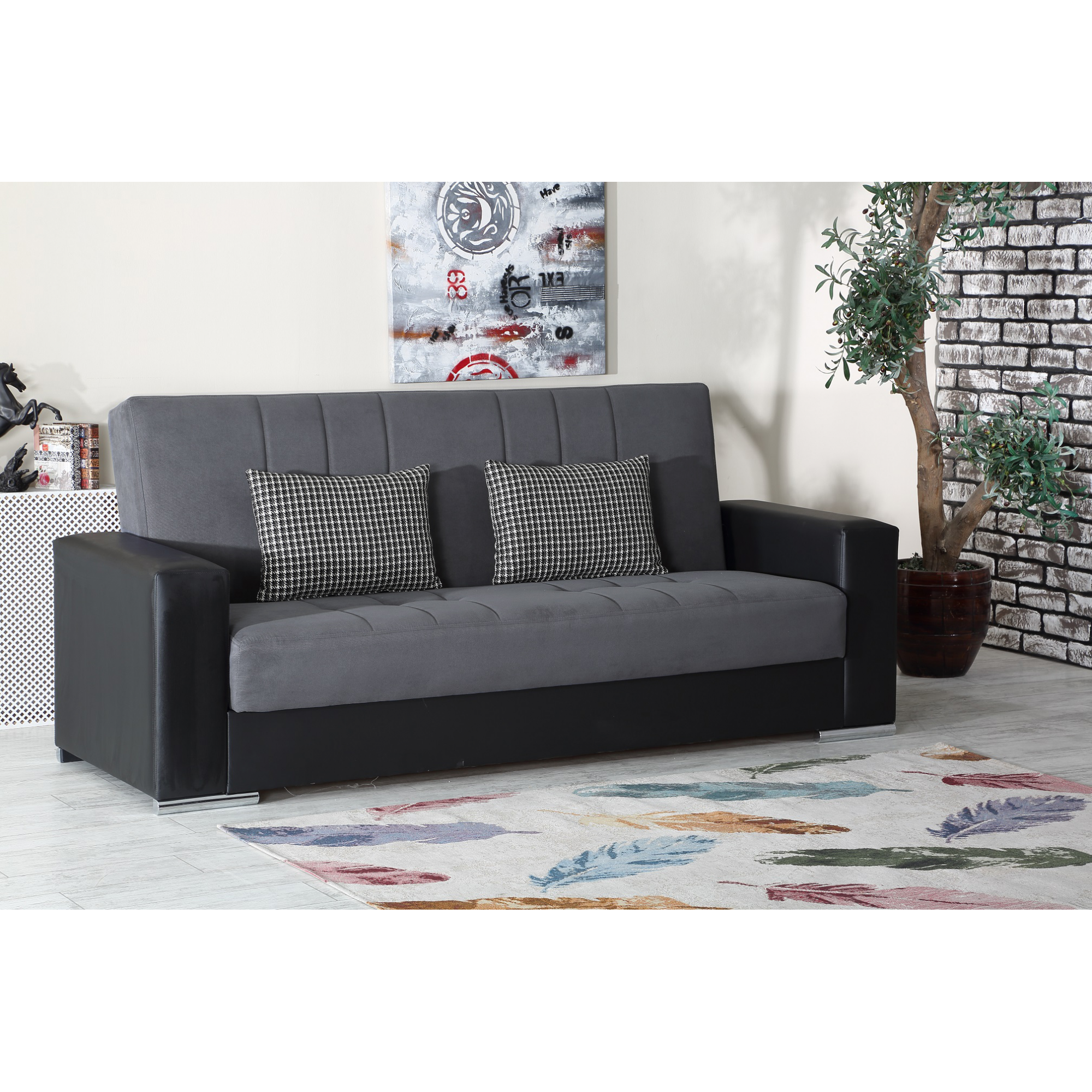 Divano Letto Reclinabile Contenitore. in Ecopelle / Microfibra di Alta qualità , colore Nero / Grigio, tre posti a sedere, Letto aperto matrimoniale da 2 piazze con sistema antiribaltamento, comprensivo di Cuscini. Piedini Rinforzati.Dotato di vano contenitore