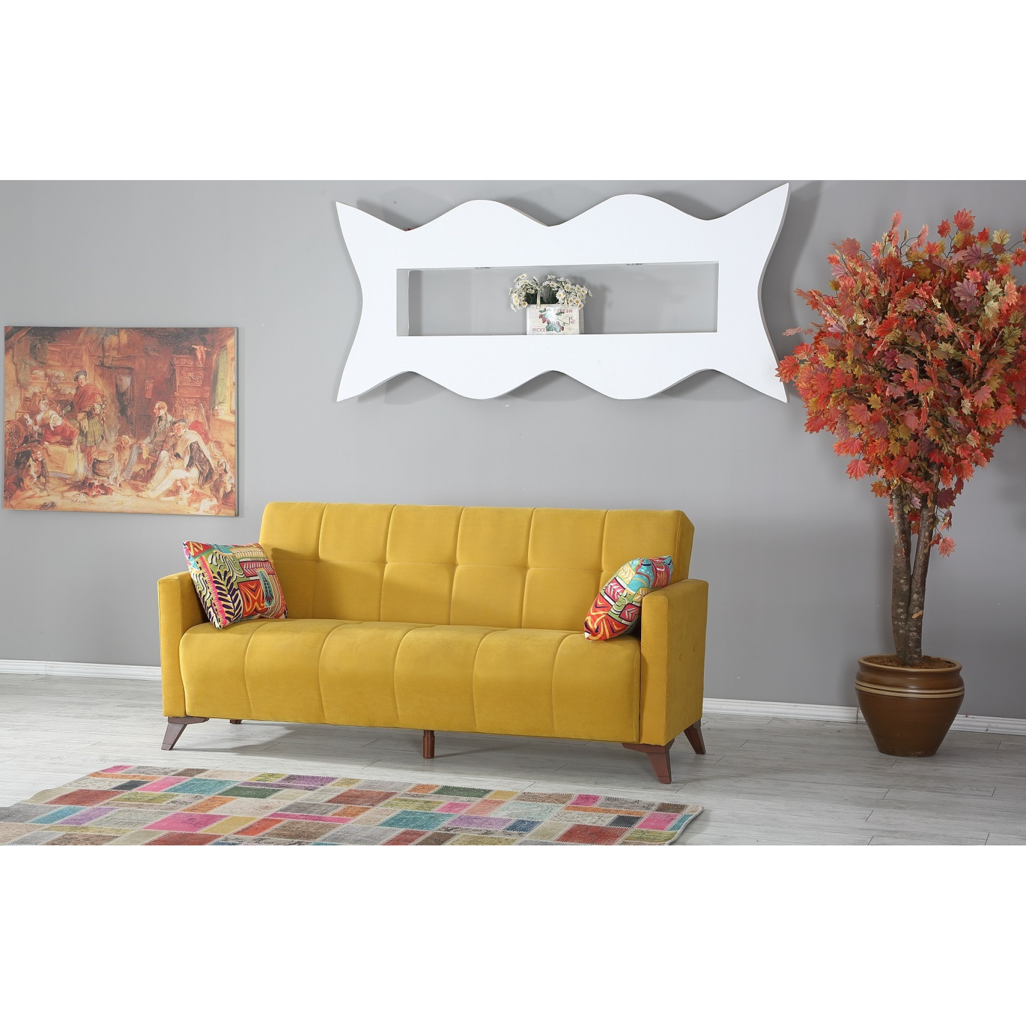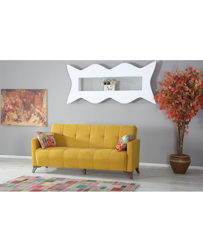 Divano Letto Reclinabile Contenitore. in Microfibra di Alta qualità , colore Senape Giallo Mustard, tre posti a sedere, Letto aperto da una piazza e 1/2 con sistema antiribaltamento, comprensivo di Cuscini. Piedini Rinforzati. Dotato di vano contenitore