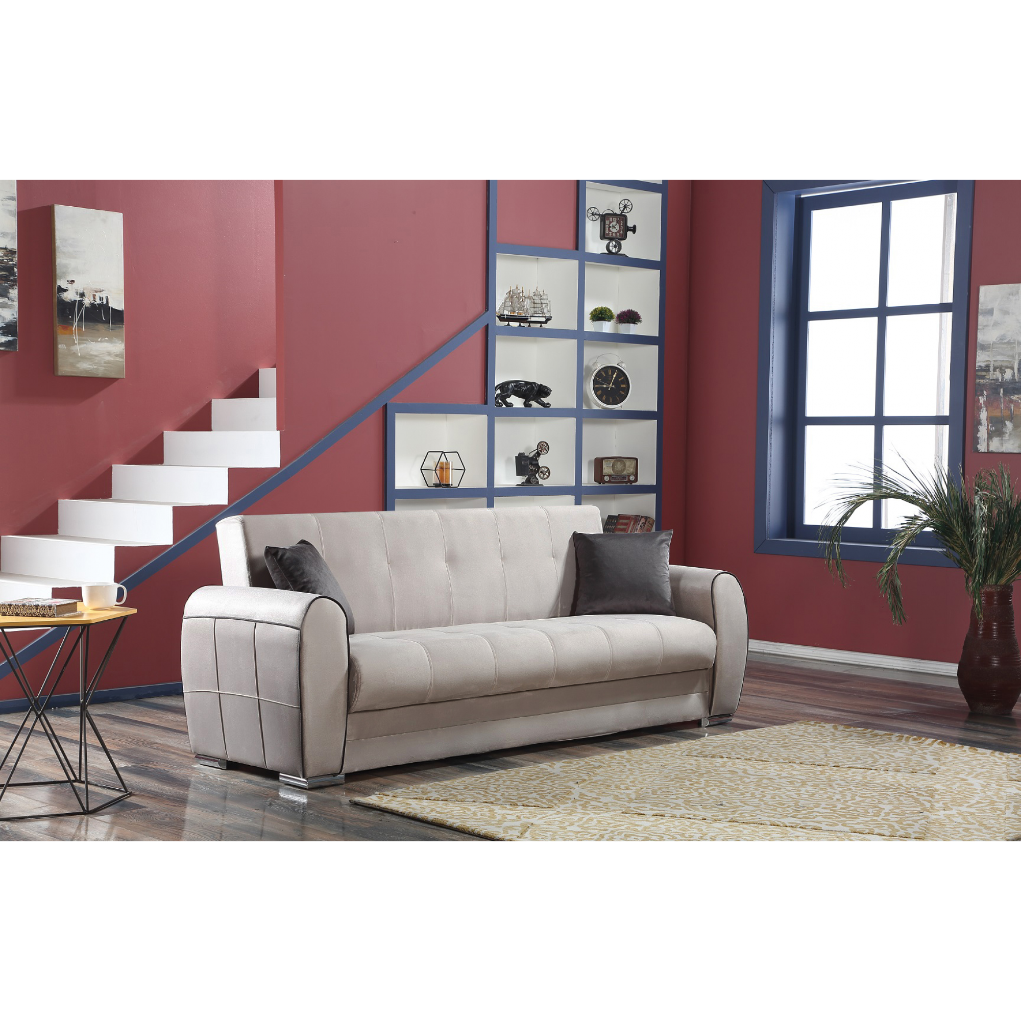 DIVANO CONTENITORE CHE DIVENTA LETTO CON AMPIO VANO CONTENITORE POSTO SOTTO LA SEDUTA, IN MDF NOBILITATO USUFRUIBILE PER TUTTO IL SUO SPAZIO, 3 POSTI CON BRACCIOLI E 2 CUSCINI ABBINATI INCLUSI, CHE NE CONFERISCONO UN TOCCO DI ELEGANZA SOBRIO ED UN INCONFONDIBILE STILE DAL DESIGN MODERNO ED ACCATTIVANTE.