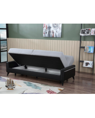 DIVANO CONTENITORE CHE DIVENTA LETTO CON AMPIO VANO CONTENITORE POSTO SOTTO LA SEDUTA, IN MDF NOBILITATO USUFRUIBILE PER TUTTO IL SUO SPAZIO, 3 POSTI CON BRACCIOLI E 2 CUSCINI ABBINATI INCLUSI, CHE NE CONFERISCONO UN TOCCO DI ELEGANZA SOBRIO ED UN INCONFONDIBILE STILE DAL DESIGN MODERNO ED ACCATTIVANTE.