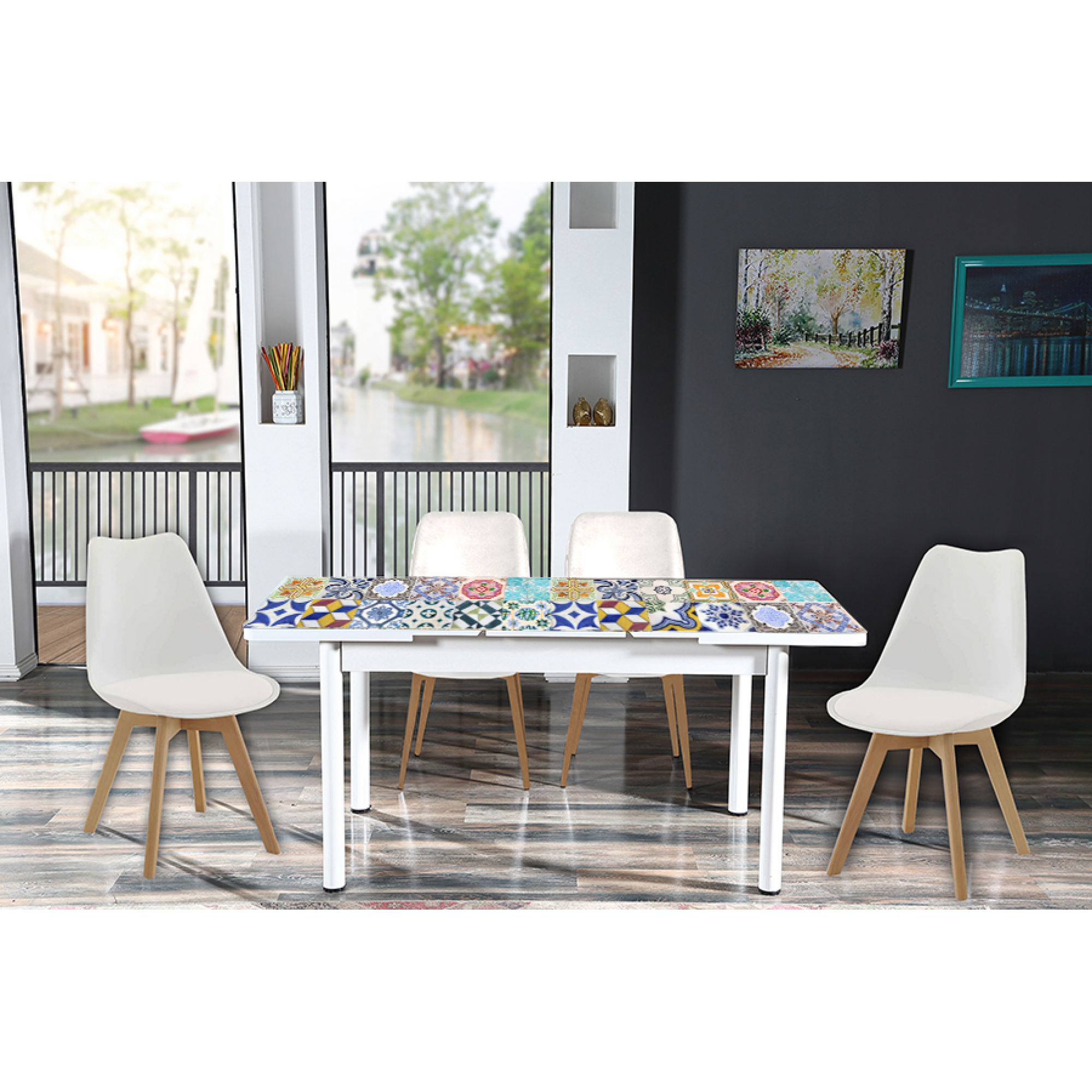 TAVOLO IN VETRO TEMPERATO ALLUNGABILE PIASTRELLA/MOSAICO COMPLETO DI SEDIE BIANCHE CON CUSCINO - DESIGN - TAVOLO PER SALA DA PRANZO / CUCINA / RISTORANTI / PUB / CASA VANCANZE. TAVOLO CON SERIGRAFIA INCISA DIRETTAMENTE SUL VETRO TRAMITE STAMPANTE LASER UV. QUALITA' ELEVATA (NESSUNA PELLICOLA), STAMPA ULTRAVIOLETTI CON SISTEMA DI RISCALDAMENTO AD INCISIONE DIRETTA SUL VETRO, QUESTO SISTEMA GARANTISCE UN PRODOTTO DAL DESIGN UNICO SENZA RINUNCIARE ALLA QUALITA'. PREZZO DA INGROSSO, COMPRENSIVO INFATTI ANCHE DEL SET COMPOSTO DA 4 SEDIE IN POLIPROPILENE BIANCO CON CUSCINO IN ECOPELLE INCLUSO.