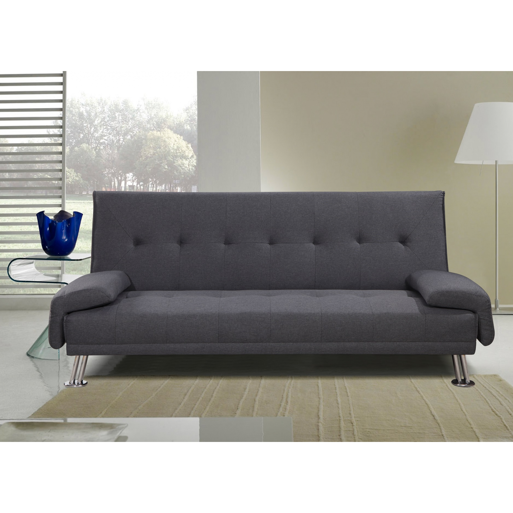 Divano Letto Reclinabile. in Lino di Alta qualità, colore Grigio, tre posti a sedere, Letto aperto da una piazza e 1/2 con sistema antiribaltamento, comprensivo di Cuscini abbinati. Piedini in Metallo.