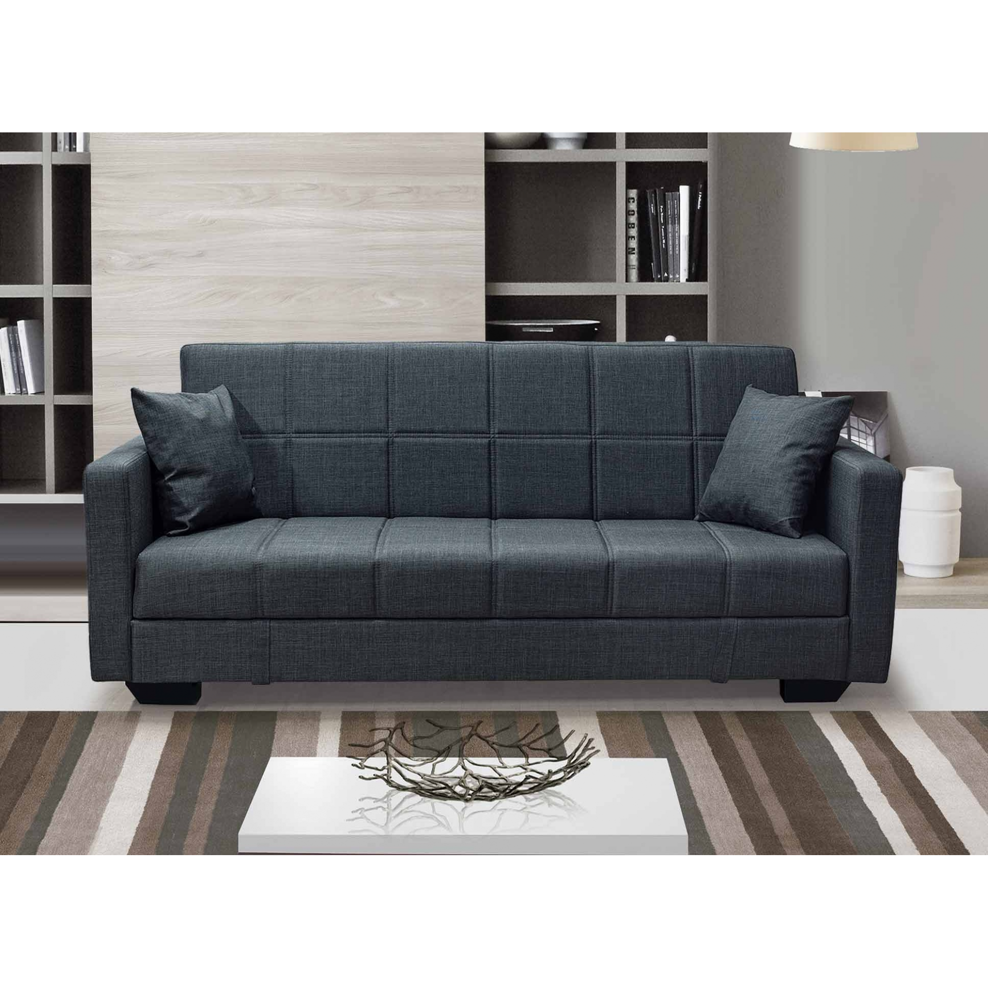 Divano Letto Reclinabile Contenitore. in Lino di Alta qualità, colore Grigio Scuro, tre posti a sedere, Letto aperto da una piazza e 1/2 con sistema antiribaltamento, comprensivo di Cuscini in Microfibra. Con vano contenitore