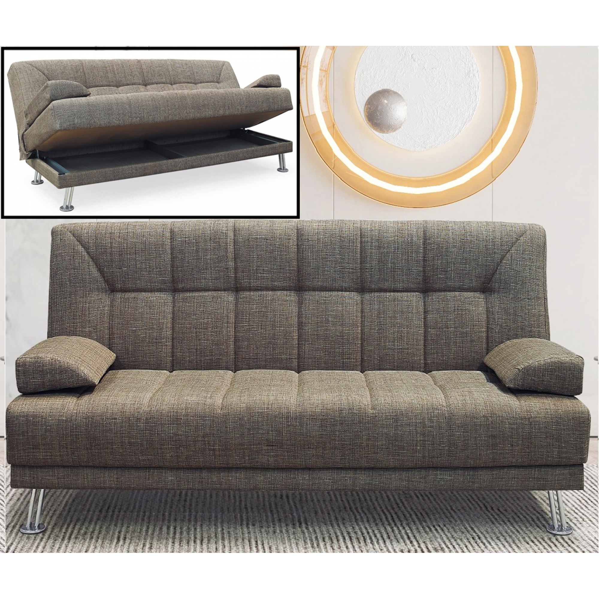 Divano Letto Contenitore Reclinabile. in Lino di Alta qualità , colore Beige Marrone, tre posti a sedere, Letto aperto da una piazza e 1/2 con sistema antiribaltamento, comprensivo di Cuscini in ecopelle. Piedini in Metallo.