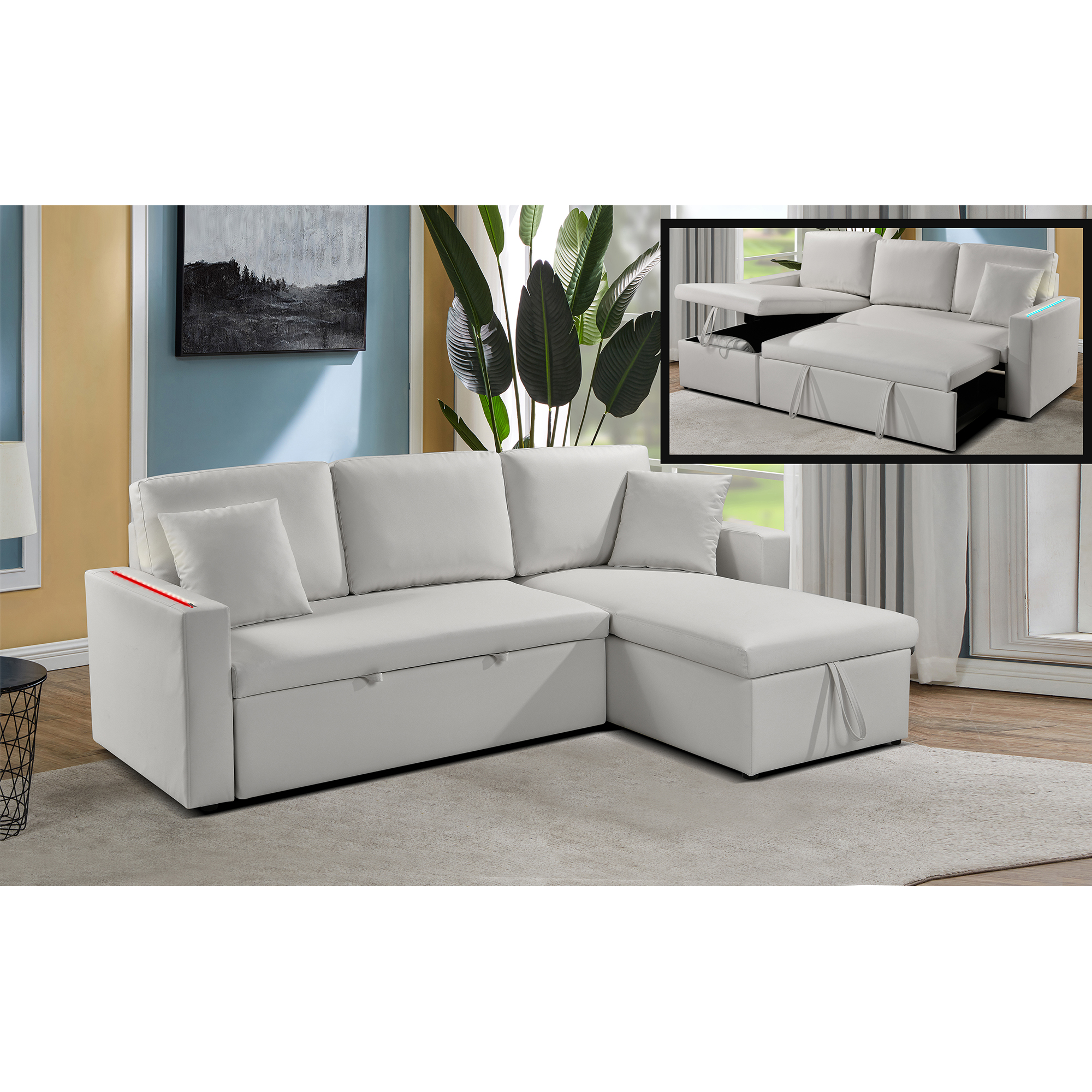 MEGA DIVANO LETTO ANGOLARE CONTENITORE REVERSIBILE DIVANO BIANCO ECOPELLE LED