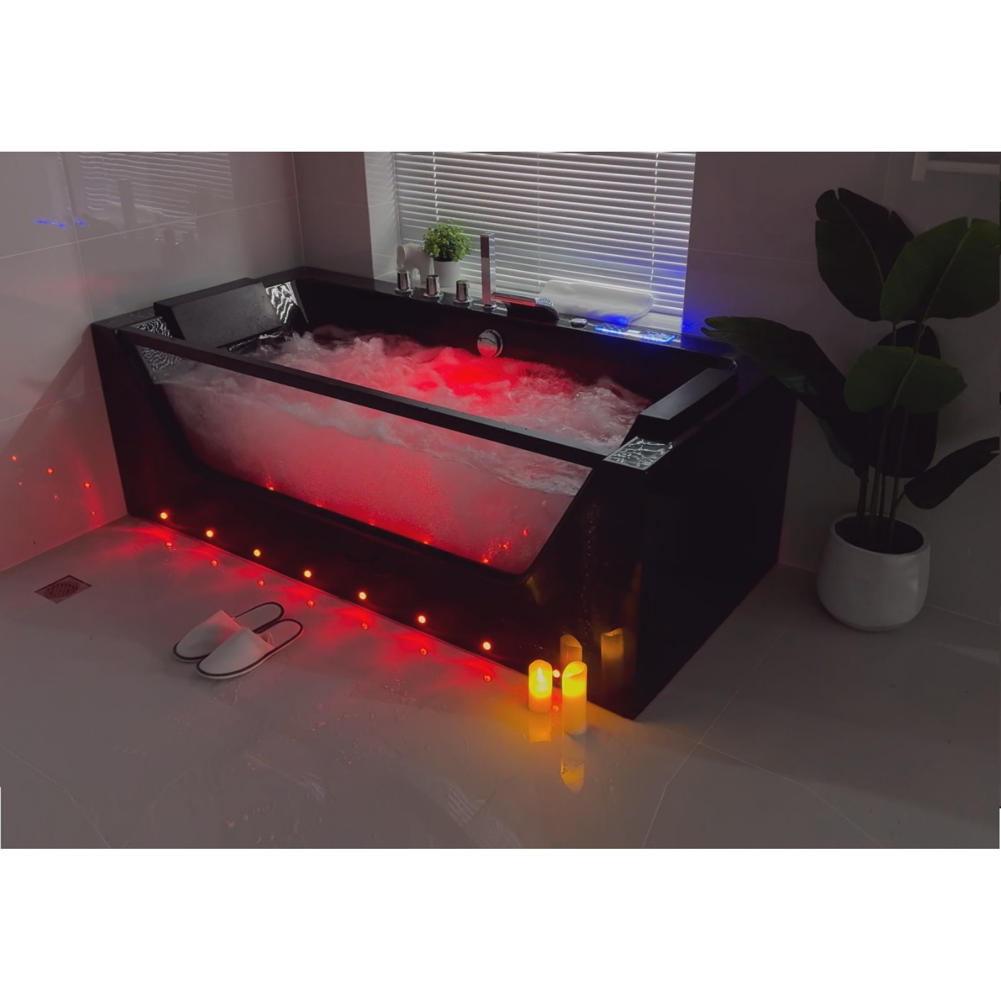 ESCLUSIVA VASCA IDROMASSAGGIO 2 POSTI NERA DI ULTIMA CONCEZIONE, NUOVISSIMO MODELLO A 4 STRATI DI PURO ACRILICO, CON PARETE IN VETRO TEMPERATO DA 8mm DESIGN MODERNO. QUESTA VASCA IDROMASSAGGIO CON BEN 30 IDROGETTI DI CUI 14 AIRLED (GETTI AD ARIA ILLUMINATI), E' COMPRENSIVA DI RISCALDATORE TERMOSTATICO, OZONO, LED SU PANNELLO - PC FULL TOUCH TERMICO - DOPPIA POMPA - RUBINETTO A CASCATA - RADIO - CASSE SORROUND - POMPA POTENZIATA CON GETTI SOTTO I CUSCINI - LUCE CROMOTERAPIA E MICRO LED + BLUETOOTH. TUTTE CARATTERISTICHE DI PREGIO PER UN PRODOTTO COMPLETO NEL SUO GENERE.