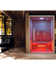 La sauna infrarossi presentata, ha capienza di 2 persone, ed è disponibile nella misura: 120x100x190cm. Viene realizzata in legno hemlock (legno Canadese), una tipologia di legno preferenziale per la costruzione delle saune. Gli elementi radianti ad eco-consumo portano al raggiungimento di una temperatura di 65° a calore secco, e la cabina sauna è in grado di isolare il calore attraverso delle pareti con coibentazione e del vetro temperato di spessore 8 millimetri. La potenza della cabina da 120x100 cm è di 1750 watt eco-tech Stufa con 5 elementi Full Spectrum Rossi).