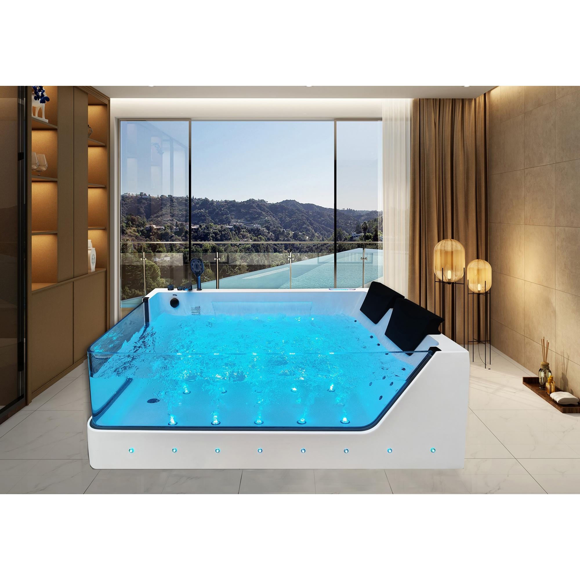 VASCA IDRO 180X90 CM (2 POSTI), SPAZIO INTERNO COMODO PER DUE PERSONE GRAZIE ALLA PRESENZA SU UN LATO DEL VETRO E NON DEL BORDO DELLA VASCA. VASCA CON RIEMPIMENTO INNOVATION DA "OVERFLOW", INTAGLIO SULLA MANOPOLA NASCOSTO PER IL RIEMPIMENTO DELLA VASCA SPA. LED LUX INNOVATION - PC FULL TOUCH TERMICO - OZONO - RISCALDATORE - AIR LED - BLUETOOTH - TELECOMANDO INCLUSO - SUPER FULL OPTIONAL CON CASCATA INTAGLIATA LED DESIGN CON IDROMASSAGGIO