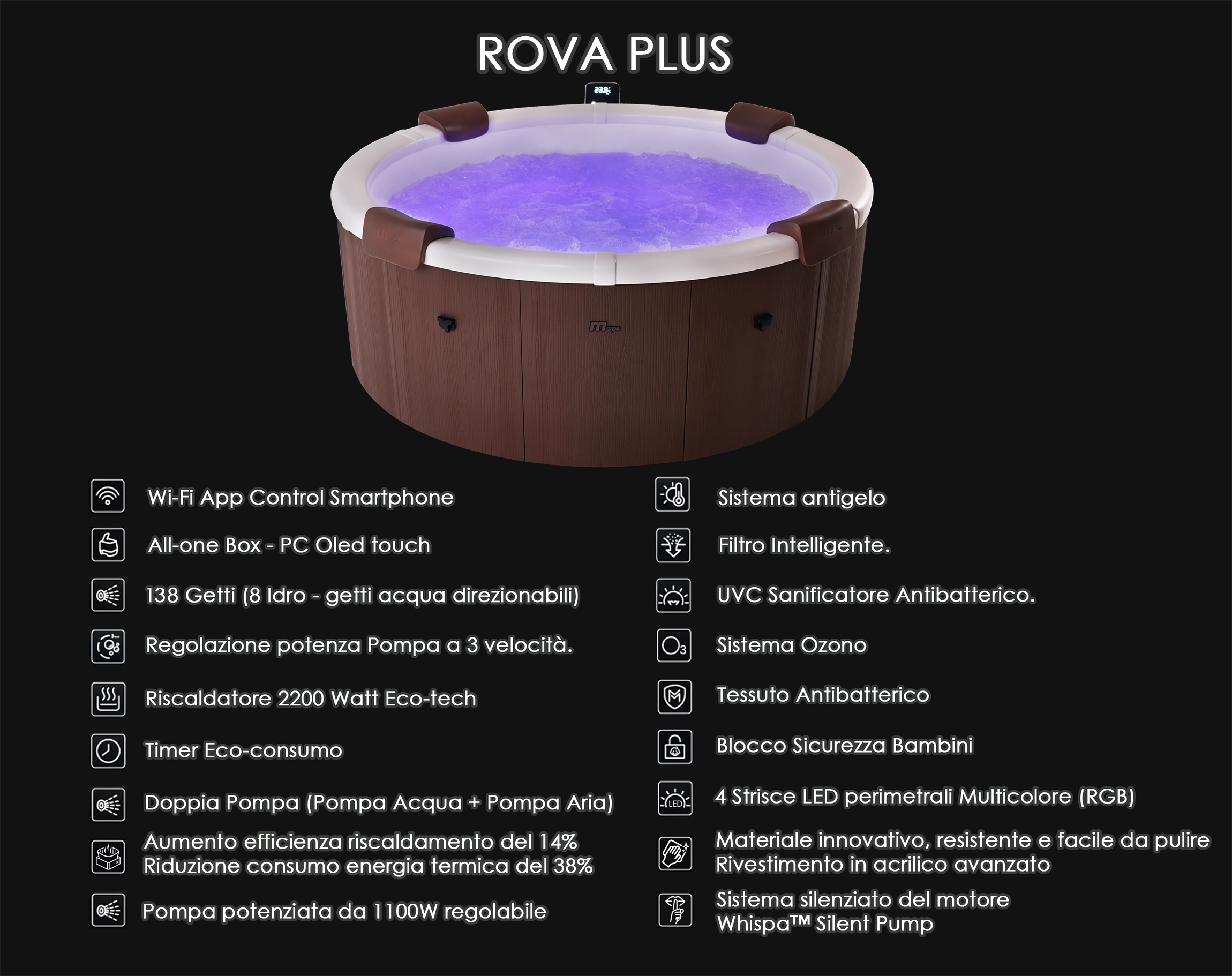 MINIPISCINA SPA ROVA PLUS KING - MINIPISCINA MSPA - VASCA IDROMASSAGGIO DA ESTERNO -182CM RISCALDATORE 6-8 POSTI - 138 GETTI - PC OLED - STRISCIA LED CIRCOLARE - UVC - SUPER ACCESSORIATA RIGIDA - KING SIZE - WI-FI