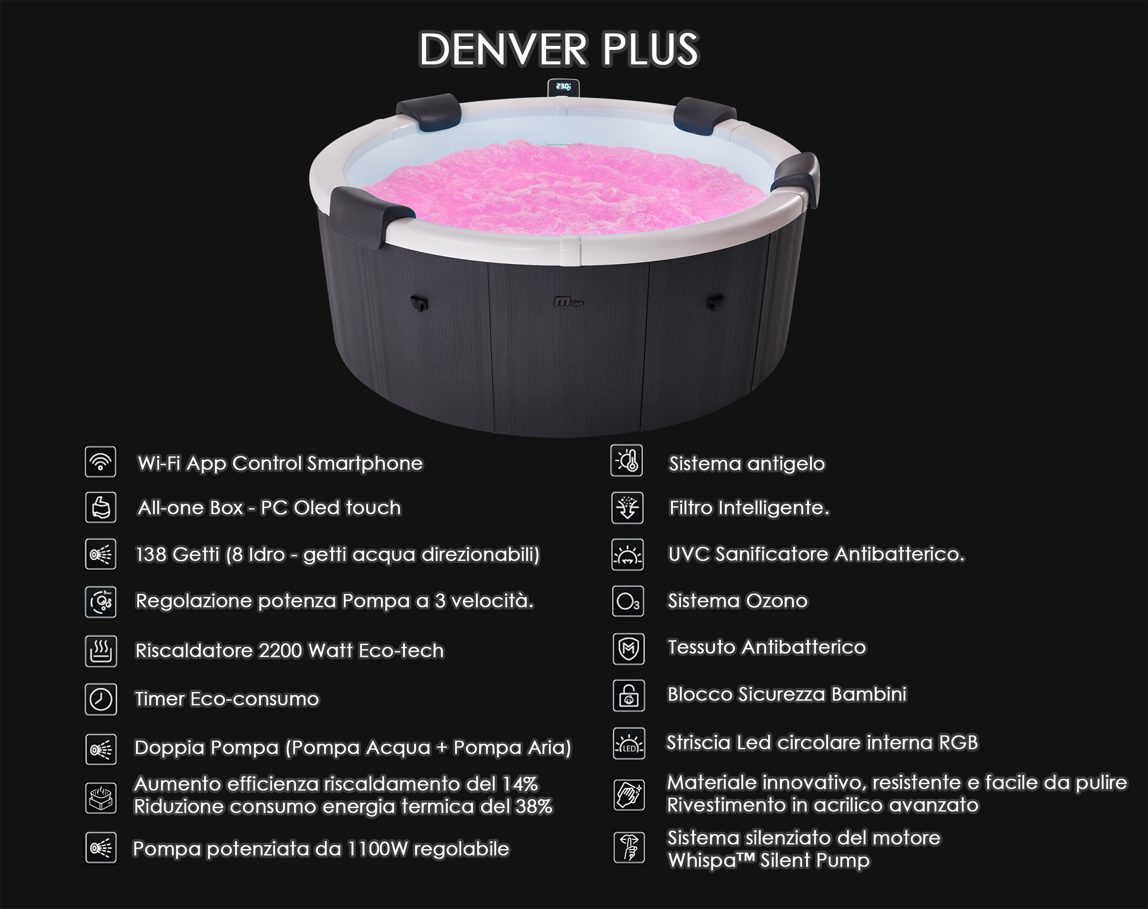 MINIPISCINA SPA DENVER PLUS KING - MINIPISCINA MSPA - VASCA IDROMASSAGGIO DA ESTERNO -182CM RISCALDATORE 6-8 POSTI - 138 GETTI - PC OLED - STRISCIA LED CIRCOLARE - UVC - SUPER ACCESSORIATA RIGIDA - KING SIZE - WI-FI