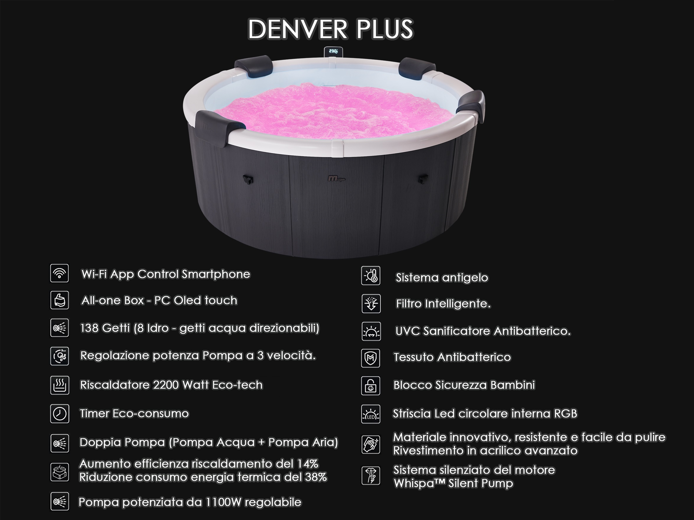 LA MSPA DENVER PLUS KING HA NUOVE TECNOLOGIE: (NUOVO PC OLED -  STRISCIA LED INTERNA MULTICOLORE PERIMETRALE - STRATO TERMICO - SILENT MOTOR - ACRYSKIN - ECO-PULSE JETS - WI-FI CONNECTION REMOTE IN SMARTPHONE APP MSPA LINK 2.0 - TELECOMANDO RGB - COPERTURA TERMICA - BOX ALL IN ONE (GESTIONE COMPUTER) - TELO APPOGGIO - MATERASSINO GALLEGGIANTE RISCALDANTE - CUSCINI PER UNA COMODA SEDUTA + CUSCINI BACK REST + CUSCINI SUL BORDO VASCA - NUOVO RISCALDATORE DA 2200WATT (ECO TECH A BASSO CONSUMO EFFETTIVO) - SISTEMA UVC SANIFICAZIONE ANTIBATTERIA INNOVATIVA - SISTEMA ANTIGELO - POMPA ARIA + POMPA ACQUA - BLOCCO DI SICUREZZA PER BAMBINI -  REGOLAZIONE INTENSITA' DELLA POMPA A 3 VELOCITA' ECO CONSUMO - FILTRO INTELLIGENTE - TIMER OROLOGIO - 2 FILTRI - ADATTATORE - SKIMMER / (DOSATORE) PER PRODOTTI INCLUSO - MANUALE D'USO COMPLETO).